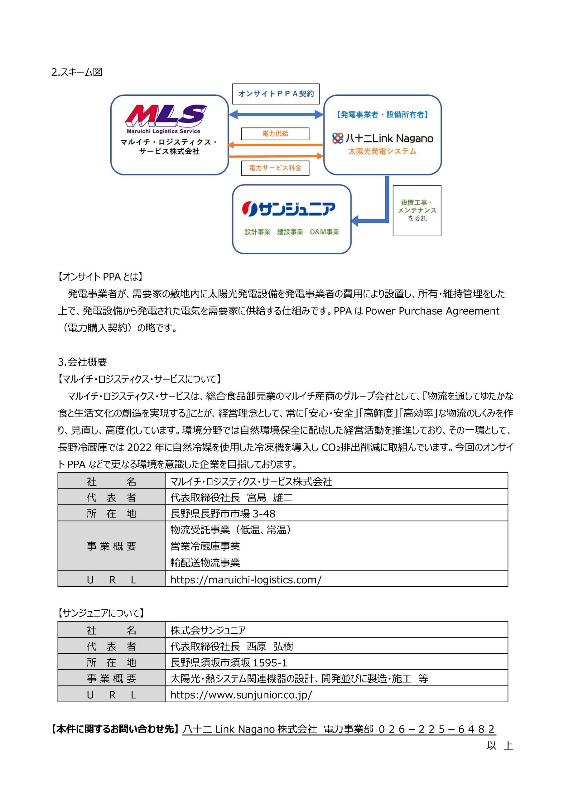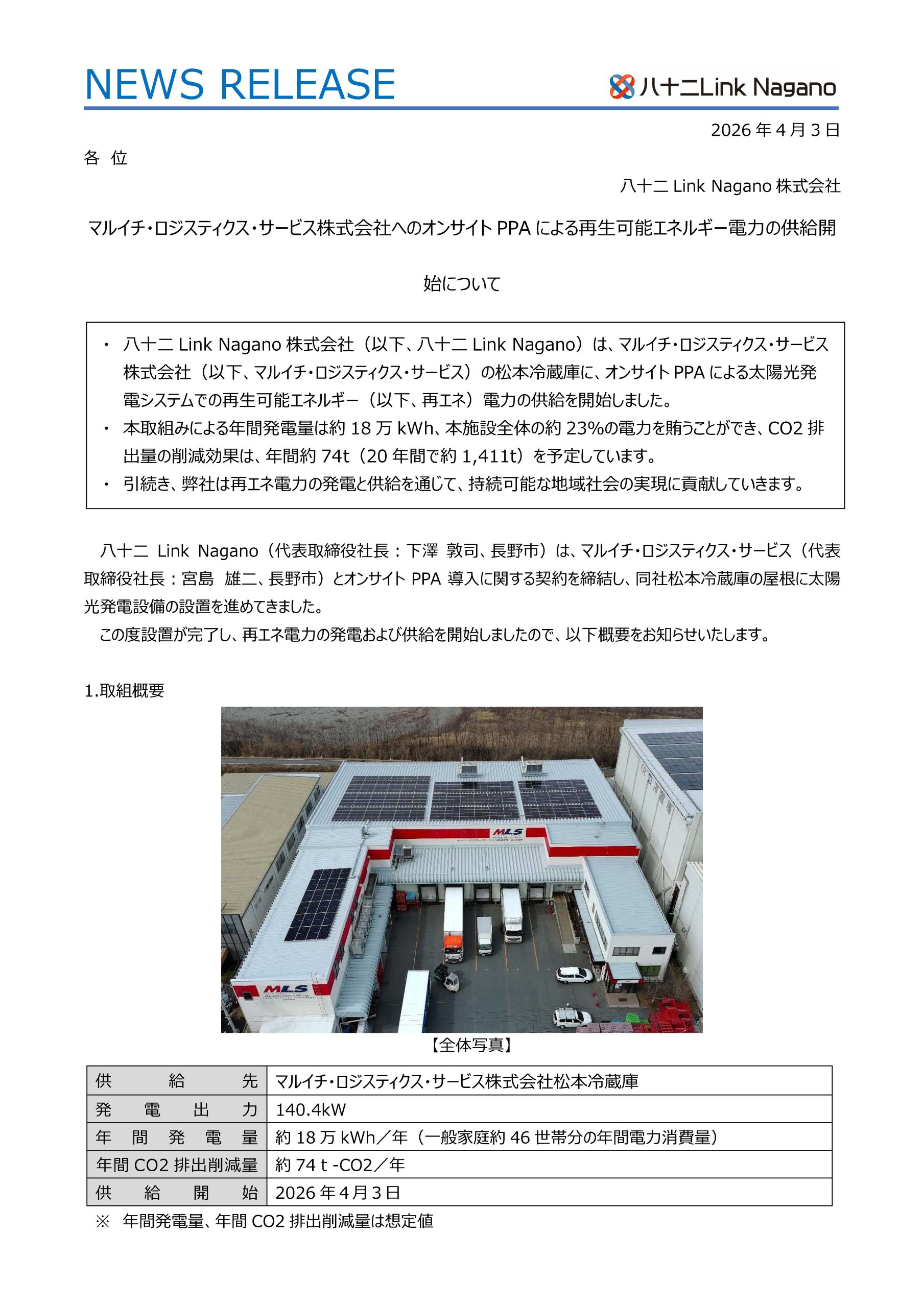 八十二Link Nagano株式会社は、マルイチ・ロジスティクス・サービス株式会社の松本冷蔵庫に、オンサイトPPAによる太陽光発電システムでの再生可能エネルギー電力の供給を開始しました。